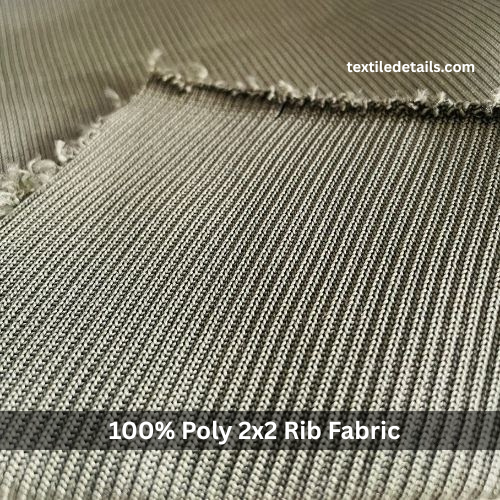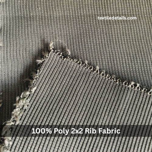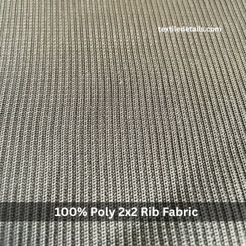 Rib Knit Fabric comprises 100% polyester fibers. It features a 2×2 rib knit construction, providing elasticity and a textured appearance. The fabric has a weight of 158 grams per square meter (GSM). The width measures approximately 57/58 inches.